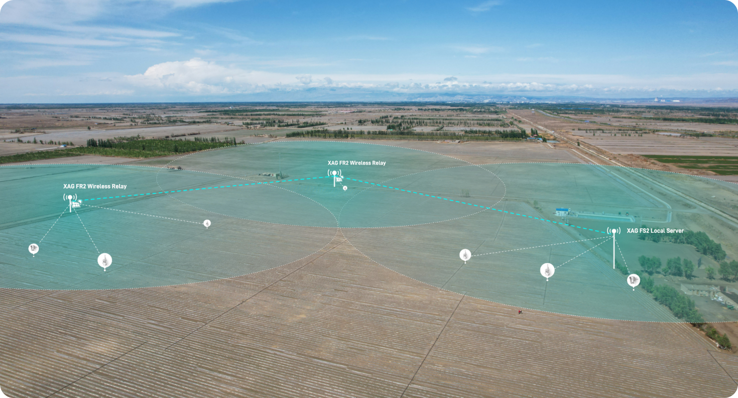 Build a secure farm network with XAG FS2 Local Server and XAG FR2 Wireless Relay for expanded coverage. No wiring or external networks needed for consistent operations.