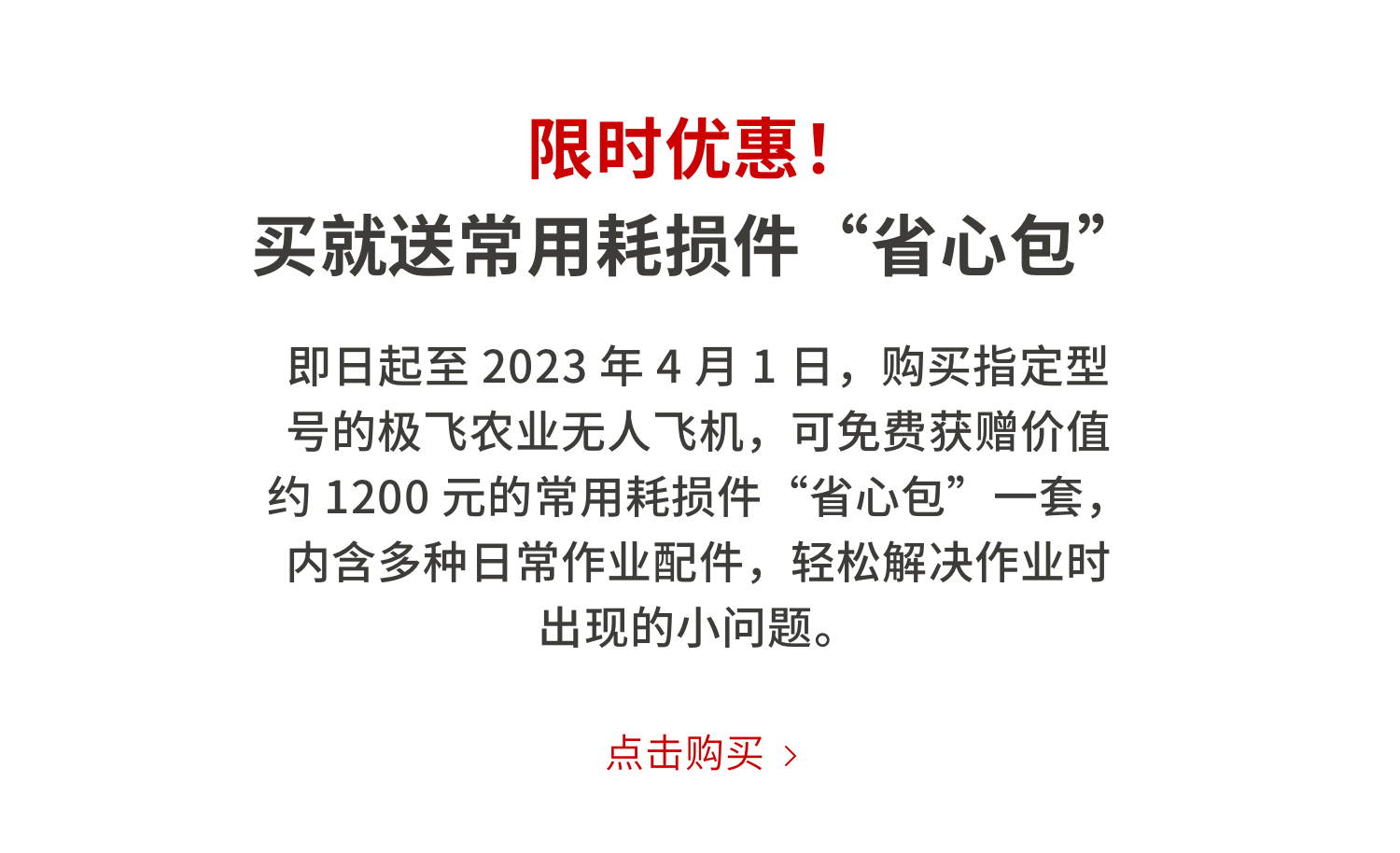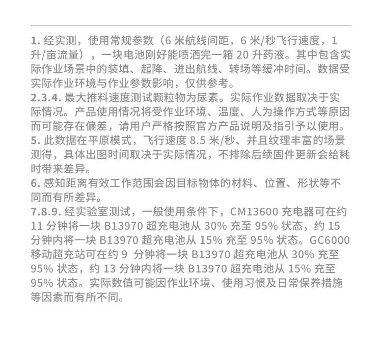 1. 经实测,使用常规参数(6 米航线间距,6 米/秒飞行速度,1 升/亩流量),一块电池刚好能喷洒完一箱 20 升药液。其中包含实际作业场景中的装填、起降、进出航线、转场等缓冲时间。数据受实际作业环境与作业参数影响,仅供参考。