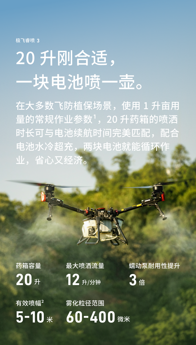 ,20 升药箱的喷洒时长可与电池续航时间完美匹配,配合电池水冷超充,两块电池就能循环作业,省心又经济。